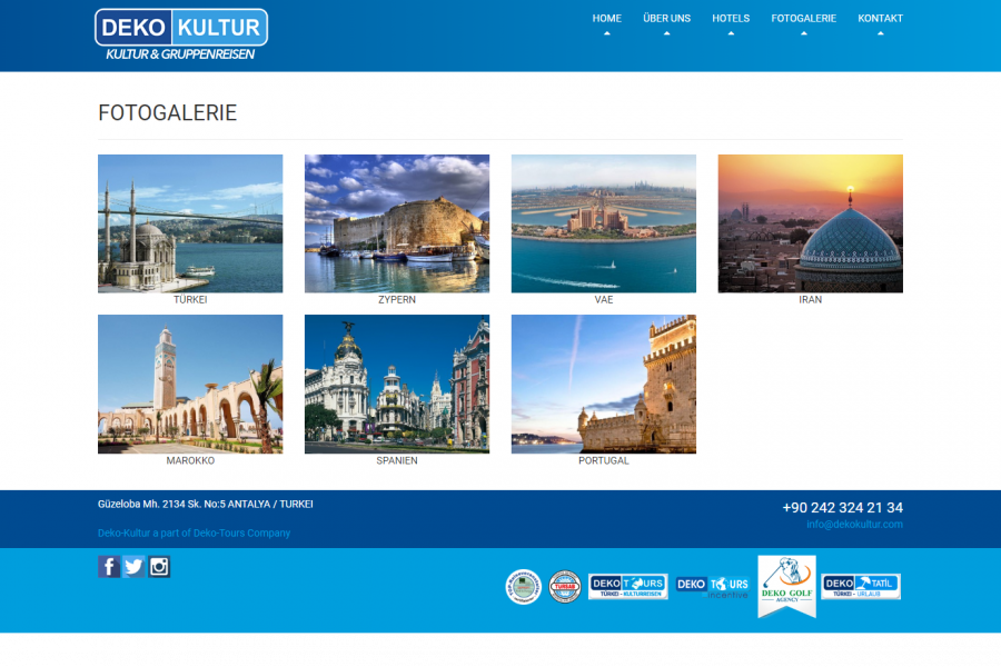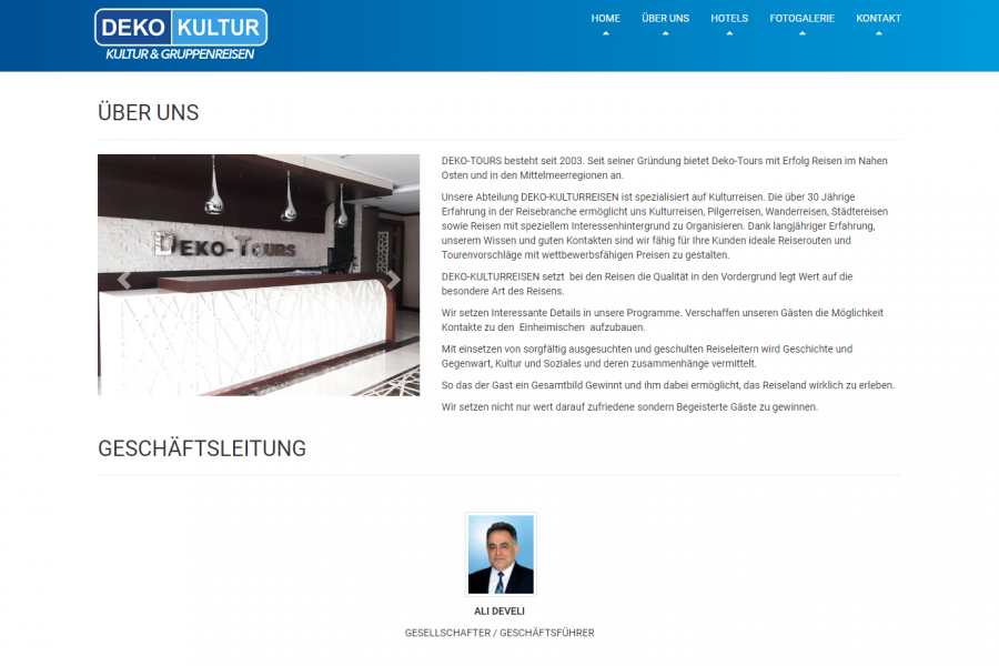 DEKO-TOURS 2003 yılından beri varlığını sürdürmektedir. Deko-Tours, kuruluşundan bu yana Orta Doğu ve Akdeniz bölgelerinde başarıyla turlar düzenlemektedir. Dijital ortamda hizmetlerini sürdürebilmek için Web yayın hayatında Destech İnternet Hizmetleri’ni tercih etmişlerdir.